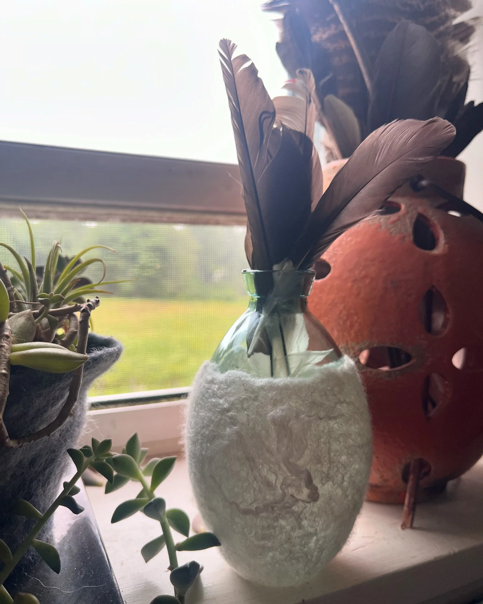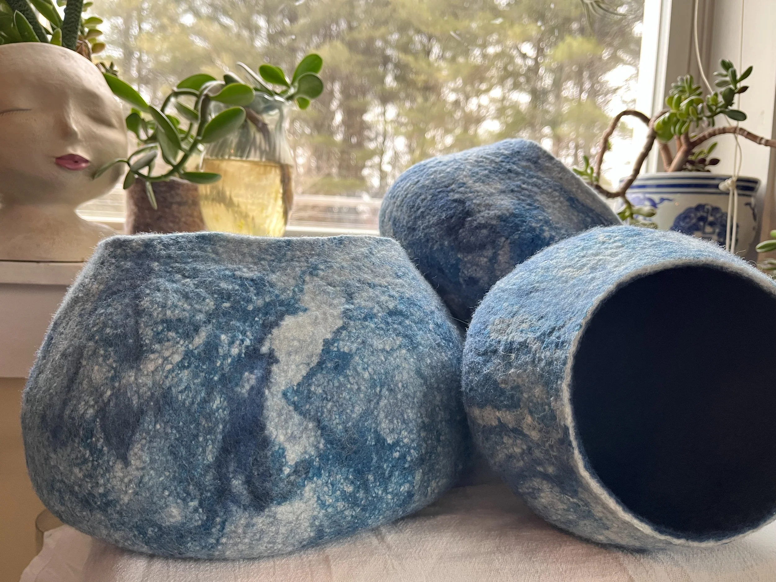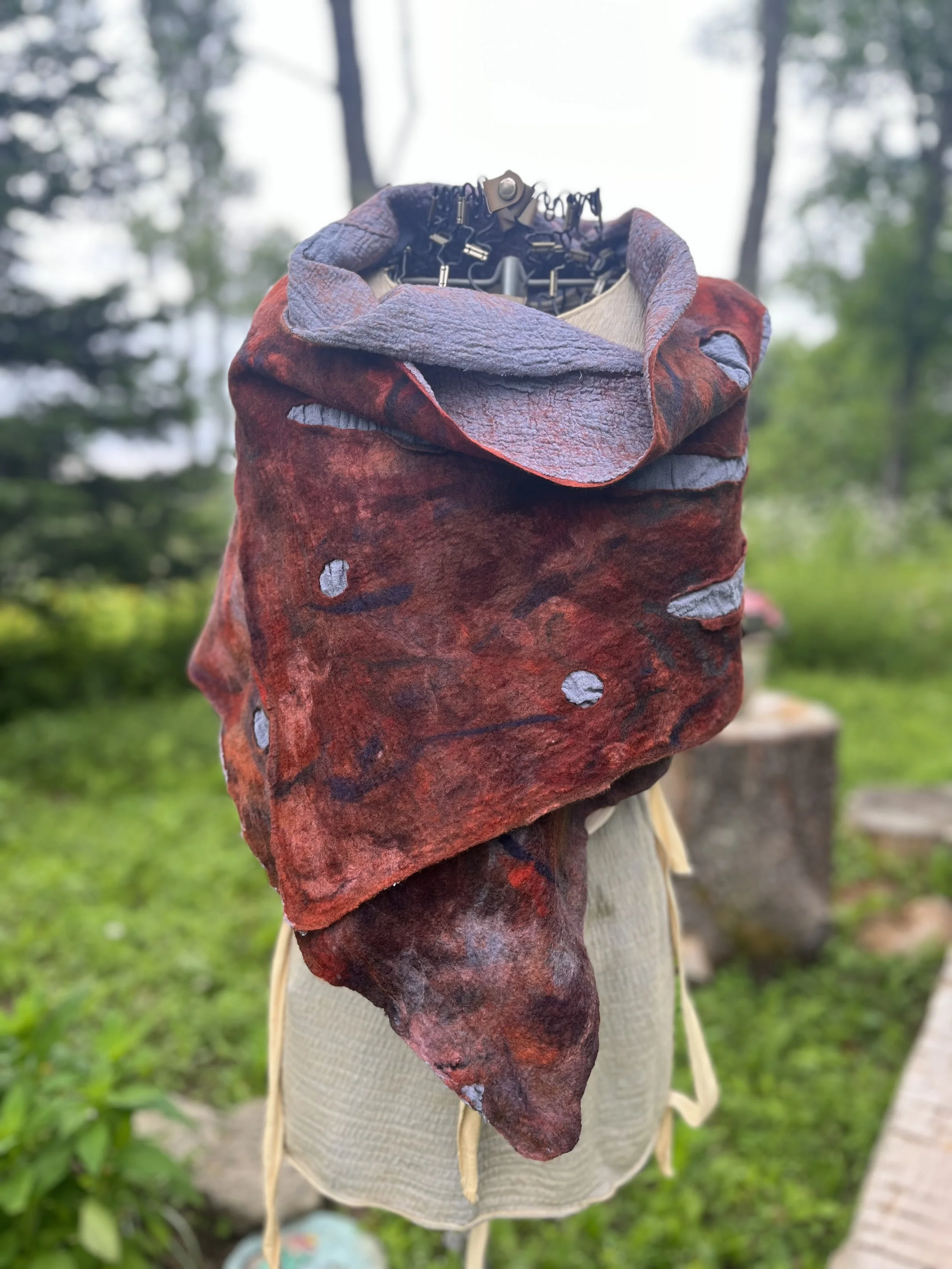 Located in Warren, Maine, my studio is full of soft merino wool, silk and other lightweight garment materials to make one-of-a-kind wearable art and home embellishment pieces. Hand crafting OOAK scarves and wraps, wall hangings, lighting, and table embellishments, I continue to learn new techniques to make use of in my work. I’m very excited to be able to share my felted pieces with you.